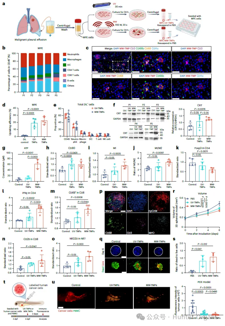 为了探究MW-TMPs的临床潜力,研究人员收集了在胸腔穿刺过程中获得的恶性胸腔积液(MPE) ,并从MPE细胞沉淀物中分离出肿瘤细胞,制备MW-TMPs和UV-TMPS。在自体MPE共培养实验中,MW-TMPs优先被肿瘤细胞摄取,其次是中性粒细胞和巨噬细胞。