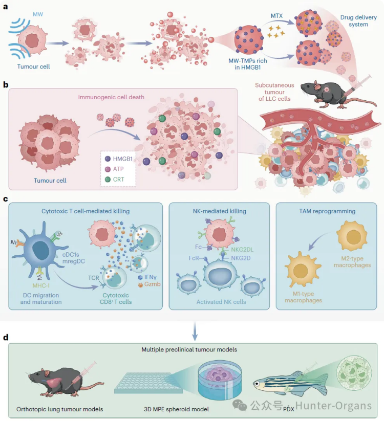 本研究首次开发了一种简便、低成本且高效的微波(MW)辐射策略,用于制备来源于肿瘤细胞的微粒(MW-TMPs),并通过患者来源的MPE和斑马鱼PDX等体内外实验证实,其不仅能诱导免疫原性细胞死亡,而且,能在不同肺肿瘤模型中,重编程抑制性肿瘤免疫微环境,实现自然杀伤细胞与T细胞对肿瘤细胞的双重靶向攻击。实验表明,MW-TMPs可高效递送甲氨蝶呤至肿瘤部位,与PD-L1阻断疗法产生协同增效,其作为一种双重功能纳米平台,在单药治疗、化疗药物递送和免疫联合治疗中均表现出卓越的性能,具有重要的临床转化潜力。