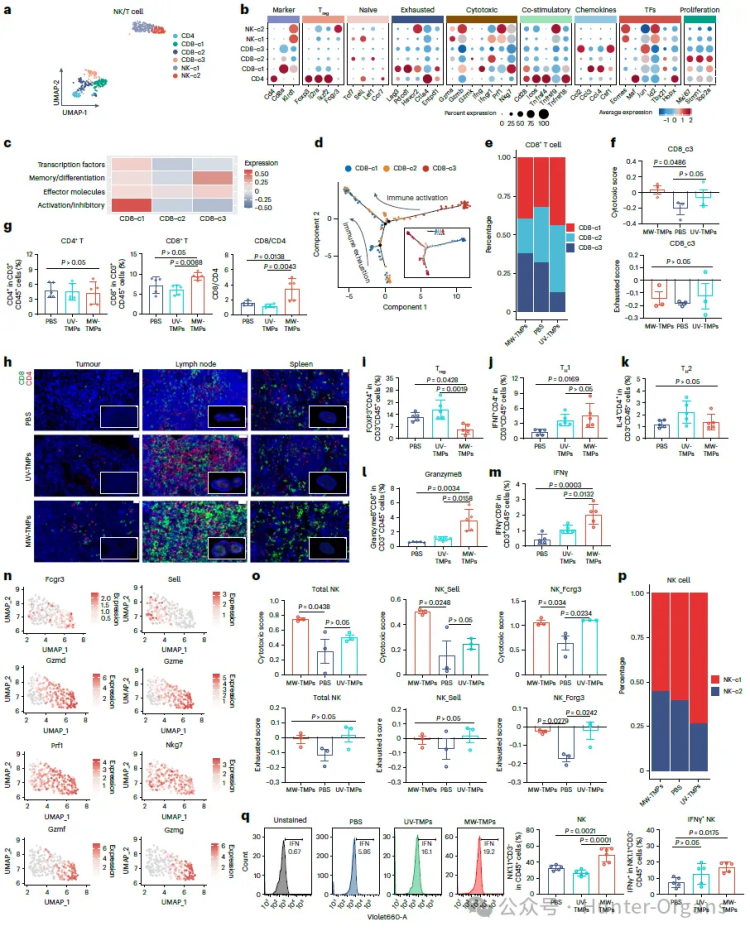 接着,研究人员探究了MW-TMPs对CD8+T细胞的影响,并对NK细胞进行了分析。结果显示,MW-TMP能显著提高CD8⁺ T细胞中Gzmb与IFNγ的表达,使其细胞毒性增加,同时降低Treg比例,而在PBS与UV-TMP组中未发现明显变化。这表明,MW-TMP通过激活抗原呈递细胞(APC)对肿瘤抗原的识别与交叉呈递,诱导肿瘤特异性CD8⁺ T细胞激活免疫反应,并促进效应/记忆型(CD8_c3)T细胞的分化,提升其杀伤功能与免疫记忆潜力。