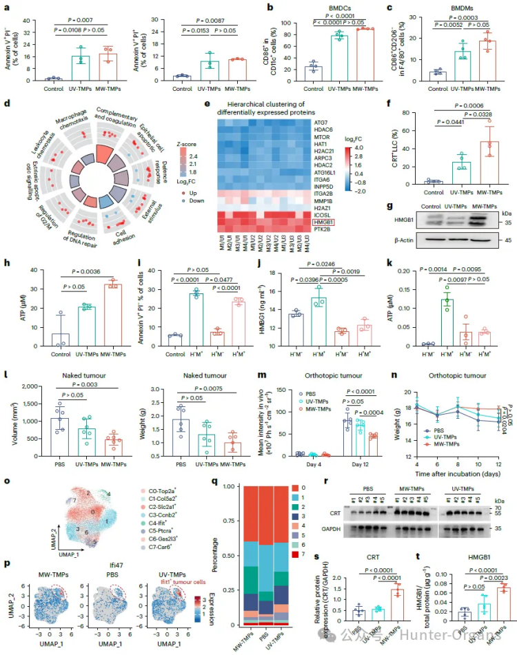 HMGB1是免疫原性细胞死亡(ICD)的关键标志物。通过ICD诱导验证发现,MW-TMP处理后的LLC细胞(Lewis肺癌细胞)的ICD标志物,如HMGB1、ATP、CRT均显著上调,HMGB1 抑制剂可阻断此效应。因此,MW-TMPs通过递送 HMGB1诱导肿瘤细胞免疫原性细胞死亡。